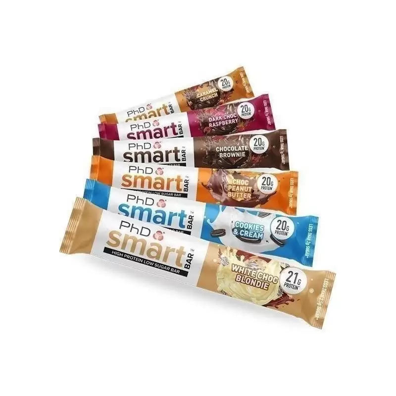 Mūsų PHD Smart Protein Bar yra patogus pasirinkimas užkandžiavimui kelyje. Šis daug baltymų turintis, skanus, mažai cukraus turintis užkandis yra puikus būdas gauti papildomų baltymų savo mitybai. Kiekvienas Smart Bar yra įdarytas minkštu išrūgų baltymų mase, meistriškai sumaišytas, kad skonis būtų neprilygstamas, ir padengtas lipnia karamele ir baltyminiais traškučiais, kad su kiekvienu kąsniu jaustumėte neįtikėtiną skonį be kaltės jausmo.